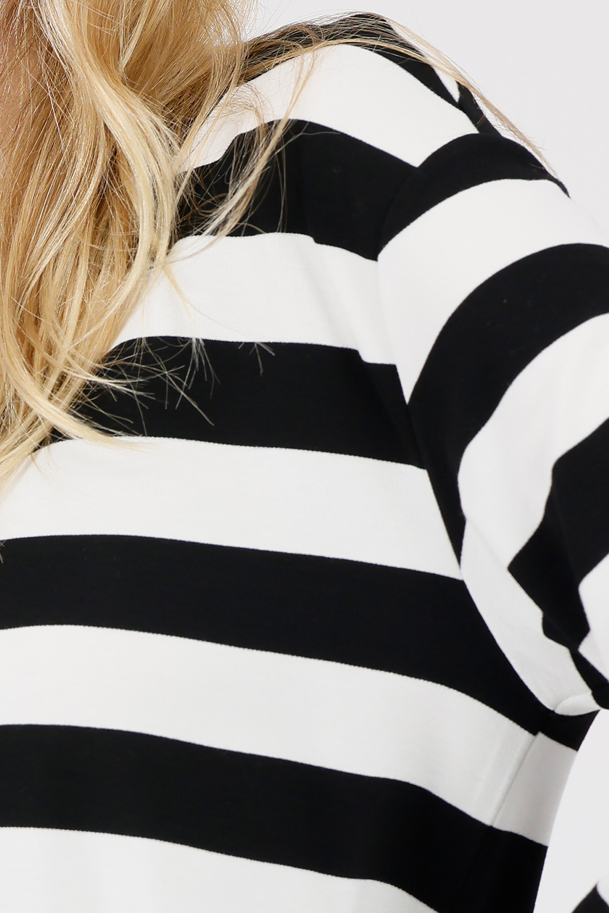 Stilvoller Pullover aus fließender Viskose und elastisches Material, Ringelmuster, Strassverzierung und harmonischem Bindeband am Saum.